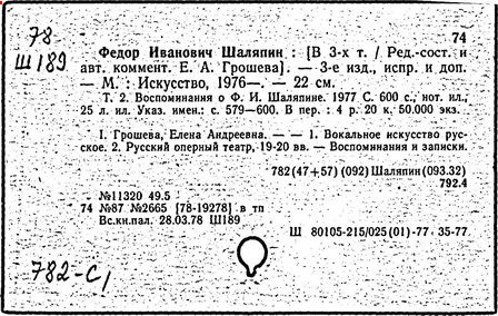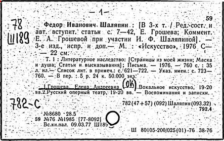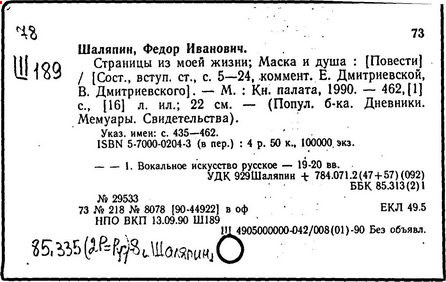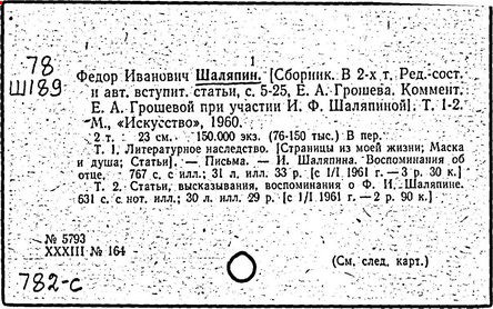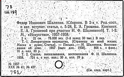 Сочинения: Страницы из моей жизни (Автобиография Ф. И. Шаляпина), "Летопись", 1917, No 1-12 (частично), полностью в кн.: Ф. И. Шаляпин, т. 1, М., 1957, 1976; Les fleurs de mon Pays, "Matin", 1908, 19 mai (рус. пер. - Шаляпин P., Цветы моей Родины, "Судоходец", Н. Новгород, 1908, 12 мая, также в кн.: Ф. И. Шаляпин, т. 1, М., 1957, 1976; Маска и душа, Париж, 1932, фрагменты в кн.: Ф. И. Шаляпин, т. 1, М., 1957, 1976; Sаlарin Teodor, Spiewak na scenie operowei, "Muzyka", t. 9, 1934 (рус. пер. - Певец на оперной сцене, "СМ", 1953, No 4, то же в кн.: Ф. И. Шаляпин, т. 1, М., 1957, 1976); Об А. М. Горьком (вместо некролога), Париж, 1936, июль, то же, в кн. Ф. И. Шаляпин, т. 1, М., 1957, 1976; Переписка Ф. И. Шаляпина с А. М. Горьким, "Горьковские чтения. 1949-52", М., 1954, также в кн.: Ф. И. Шаляпин, т. 1, М., 1957, 1976; Переписка Ф. И. Шаляпина с В. В. Стасовым, в кн.: Ф. И. Шаляпин, т. 1, М., 1957, 1976.