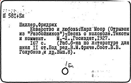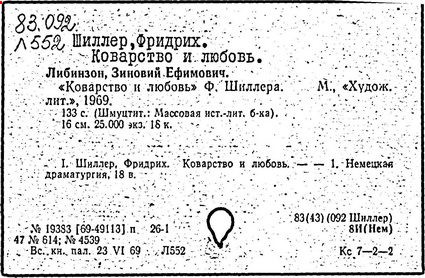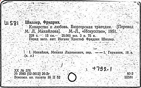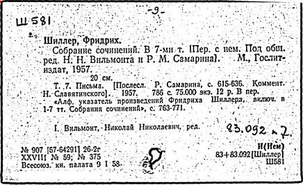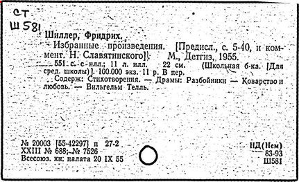 Литература: Шиллер Ф. П. Ф. Шиллер. Жизнь и творчество. М., 1955; Лозинская Л. Ф. Шиллер. М., 1960; Берковский Н. Я. Театр Шиллера // Статьи о литературе. М.; Л., 1962; Асмус В. Ф. Шиллер как философ и эстетик // Немецкая эстетика XVIII в. М., 1962; Данилевский Р. Ю. Шиллер в русской лирике 1820 - 1830-x годов // Русская литература. – 1976. – № 4; Вильмонт Н. Достоевский и Шиллер // Великие спутники. М., 1966; Фр. Шиллер. Статьи и материалы. М., 1966; Schiller. Reden, im Gedenkjahr 1955. Stuttgart, 1955-1961; Schiller in unserer Zeit. Weimar, 1955; Buchwald R. Schiller. Leben und Werk. 4 Aufl. Wiesbaden, 1959; Piana Th. F. Schiller. Bild-Urkunden zu seinem Leben und Schaffen. Weimar, 1957; Fambach O. Schiller und sein Kreis in der Kritik ihrer Zeit. Berlin, 1957; Wiese B. Fr. Schiller. Stuttgart, 1959; Abusch A. Schiller. Größe und Tragik eines deutschen Genius. 3 Aufl. Berlin, 1962; Storz G. Der Dichter Fr. Schiller. 3 Aufl. Stuttgart, 1963; Kostka E. K. Schiller in Russian Literature. Phil., 1965; Staiger E. Fr. Schiller. Z., 1967; Harder Н. B. Schiller in Rußland: Materialien zu einer Wirkungsgeschichte. 1789-1814. Bad Homburg, 1969; Borchmeyer D. Tragödie und Öffentlichkeit. Schillers Dramaturgie im Zusammenhang seiner Östhetischpolitischen Theorie und die rhetorische Tradition. München, 1973; Vulpius W. Schiller-Bibliographie, 1893-1963. Bd. 1-2. Weimar, 1959.