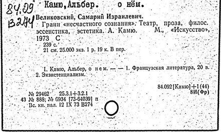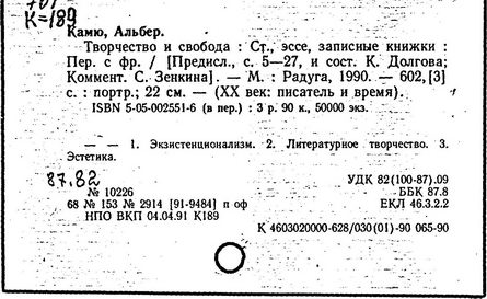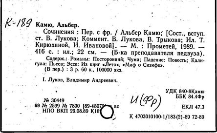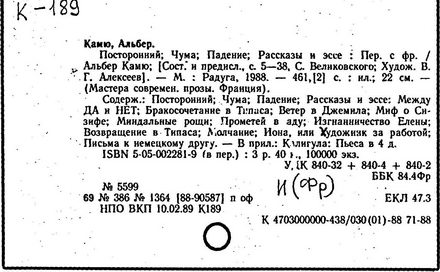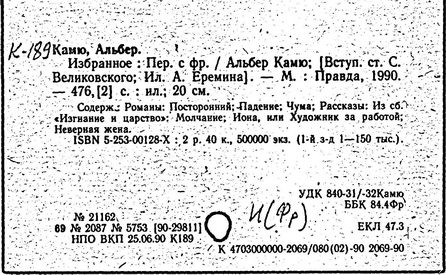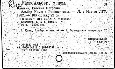 Литература: Шкунаева И. Д. Современная французская литература. М., 1961; Евнина Е. М. Современный французский роман, 1940-1960. М., 1962; Михайлова Л. Некоторые аспекты гуманизма в философии А. Камю // Труды Московского института народного хозяйства". – 1967. – № 47; Карпушин В. А. Концепция личности у А. Камю // Вопросы философии. – 1967. – № 2; Nicolas A. A. Camus. Paris, 1966; Quillot R. La mer et les prisons, essai sur A. Camus. Paris, 1956; Crepin S. A. Camus. Essai de bibliographie. Bruxelles, 1960.