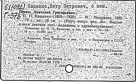 Литература: Юдин Т., Очерки истории психиатрии, М., 1951; Андреев А. Л., П. П. Кащенко и его роль в отечественной психиатрии, «Журнал невропатологии и психиатрии им С. С. Корсакова», 1959, т. 59, в. 3.