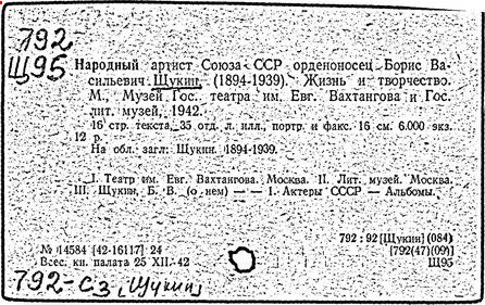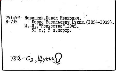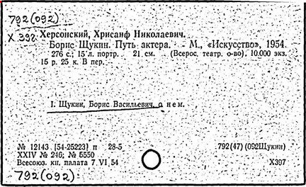 Литература: Марков П. Театральные портреты: Сб. статей. М.; Л., 1939; Лебедев Н. А. Щукин – актер кино. М., 1944; Бачелис Т. Великий советский артист Б. В. Щукин. М., 1956.