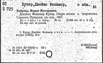 Литература: История американской литературы, т. 1, М. - Л., 1947; Боброва М., Дж. Ф. Купер, Саратов, 1967; Spiller R. Е., Blackburn P. С., A descriptive bibliography of the writings of James Fenimore Cooper, N. Y., 1934; Walker W. S., James Fenimore Cooper. An introduction and interpretation, N. Y., 1962 (библ. с. 127-33); House К. S., Cooper's Americans, Columbus (O.), [1965]; Dekker G., James Fenimore Cooper the novelist, L., 1967.
