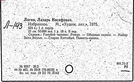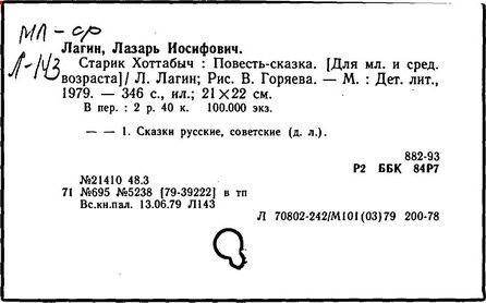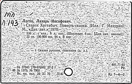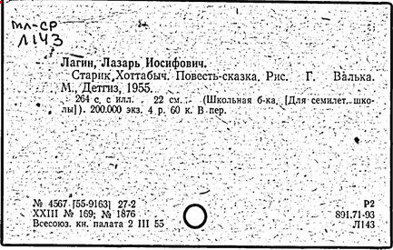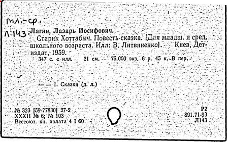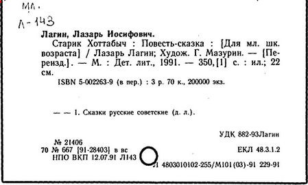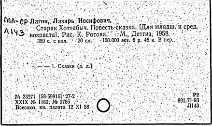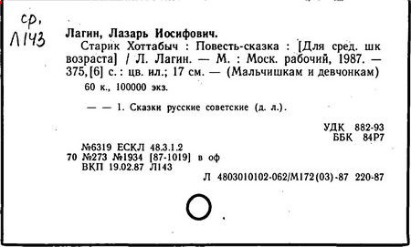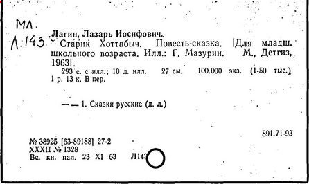 Замысел, который родился в этот период, нашел воплощение в повести-сказке «Старик Хоттабыч», опубликованной в 1938 г. в журнале «Пионер». Повесть вышла отдельной книгой в 1940 г. В ней рассказывается о веселых и поучительных приключениях двух пионеров и джинна, перенесенного из сказок Шахерезады в наши дни. Повесть выдержала множество изданий и переведена на многие языки. Следует отличать первую редакцию повести от второй, которая увидела свет в 1955 г. и где не только заменены многие эпизоды и персонажи, но и сама книга значительно выросла в объеме. На основании второй редакции Лагин написал одноименный киносценарий (фильм поставлен в 1957 г. режиссером Г. Казанским).