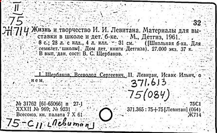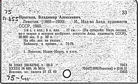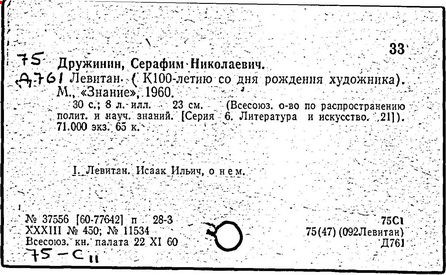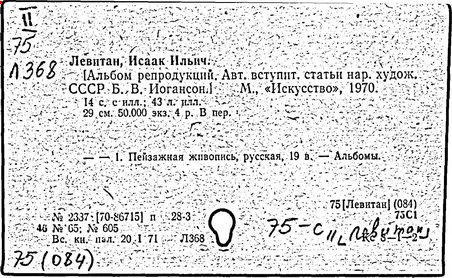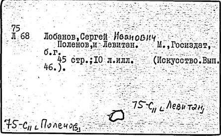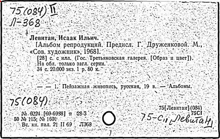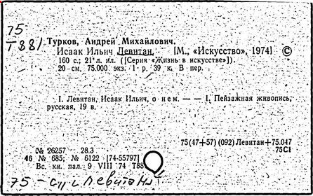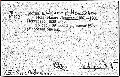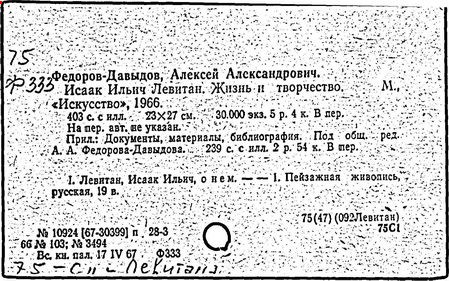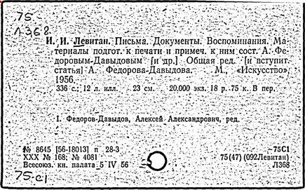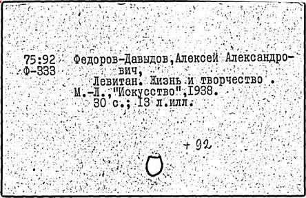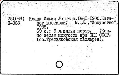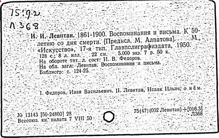 Литература: И. И. Левитан. Письма. Документы. Воспоминания, М., 1956; Исаак Ильич Левитан. Каталог выставки..., М., 1960; Федоров-Давыдов А. А., Исаак Ильич Левитан. Жизнь и творчество, т. 1-2, М., 1966.