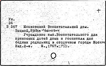 Здание Воспитательного дома в XVIII – начале XIX вв. занимало одну квадратную версту и было рассчитано на проживание 8 тыс. человек (часть его сдавалась внаём под квартиры). В Воспитательном доме в разное время жили и работали историк Г. Ф. Миллер, филолог А. Х. Востоков, врач В. Ф. Снегирёв, геолог И. П. Щуровский, историки С. М. Соловьёв, И. Е. Забелин, В. О. Ключевский, художники И. И. Левитан, Н. Л. Бенуа, В. В. Верещагин и др. Воспитательный дом, крупнейшее общественное здание Москвы XVIII в., ставшее воплощением идей Просвещения в России, был заложен по инициативе И. И. Бецкого на Васильевском лугу (ныне Москворецкая набережная, 7, на месте разобранных в 1760 г. стен Белого города) по лаконичному плану – 2 квадратных боковых корпуса (для мальчиков и для девочек) вокруг замкнутых дворов и центральный корпус, так называемый корделож. Строительством руководил К. И. Бланк (в разработке проекта принимали участие Ю. М. Фельтен и, предположительно, М. Ф. Казаков). В 1763 – 1767 гг. построено западное каре, а в 1771 – 1781 гг. – главный корпус с квадратным в основании куполом, увенчанным шпилем.