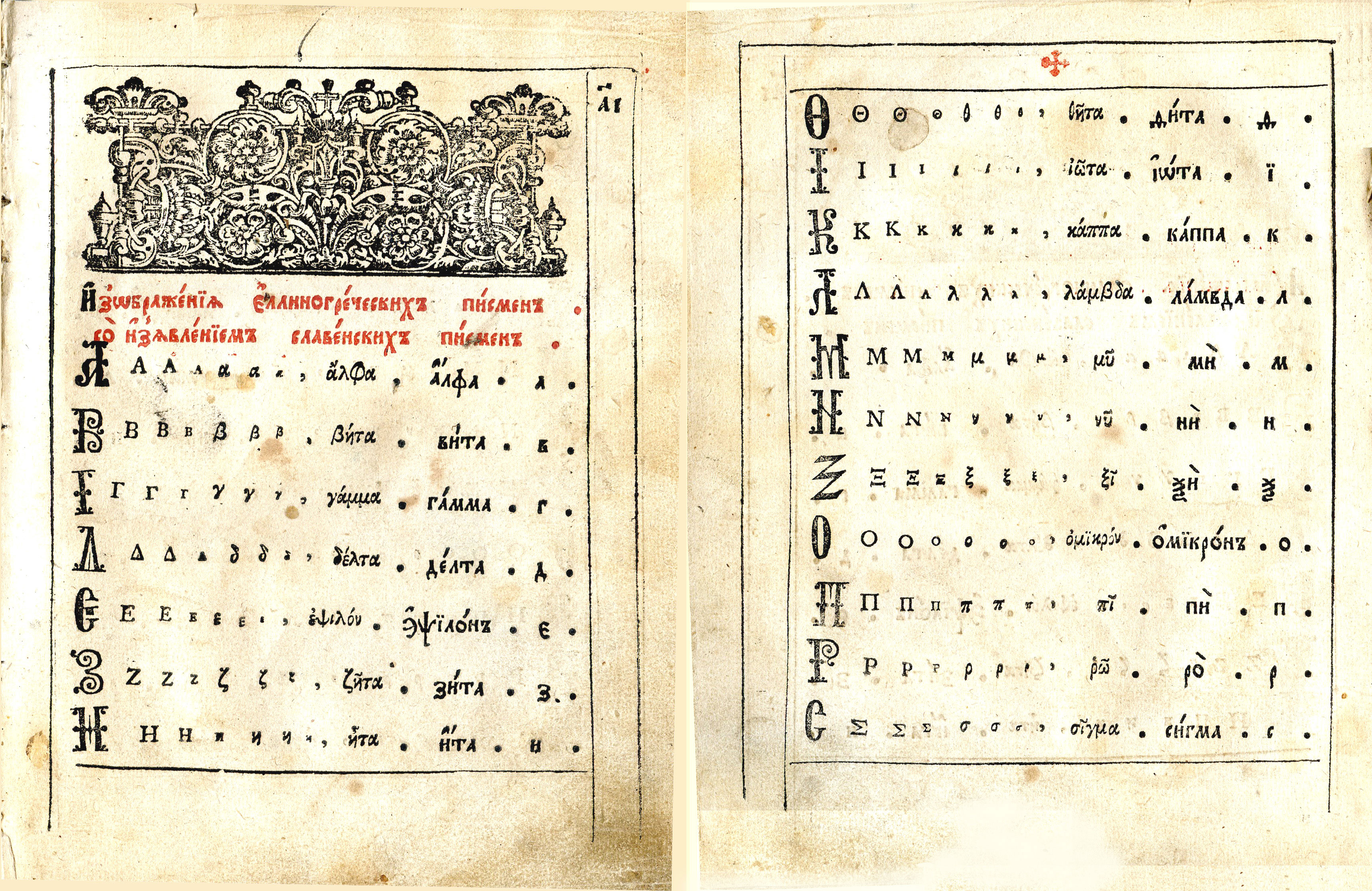 Обучение греческому и латинскому языкам строится по той же схеме, что и достаточно подробно описанная схема обучения славянскому языку. «Изображения елинногреческих писмен со изъявлением славенских писмен» (Рис. 6), «Писмена латинские большие и меньшие со изъявлением славенских писмен» (Рис. 7).