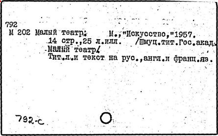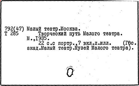 (Москва, Театральная площадь, 1/6) – один из старейших русских театров, сыгравший выдающуюся роль в развитии национальной культуры. Официально открылся 14(26).10.1824 г. Основу драматической труппы Малого театра составила группа актёров сгоревшего в 1805 г. Петровского театра, к которым присоединили новых артистов, в основном из числа крепостных, купленных Дирекцией Императорских театров. На протяжении XVIII — начала XIX вв. московская драматическая труппа работала вместе с оперно-балетной. В 1824 г. драматические спектакли были перенесены в здание, перестроенное архитектором О.И. Бове из частного дома купца В.В. Варгина на Петровской площади (с 1829 г. – Театральная); в 1838 – 1840 гг. перестроено архитектором К.А. Тоном, в 1947 г. реконструировано архитектором А.П. Великановым.