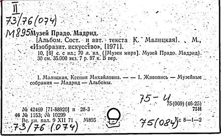 Литература: [Малицкая К.]. Музей Прадо. Мадрид: [альбом]. М., 1971; Sánchez A. P. El museo del Prado. Barcelona, 1971.