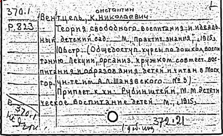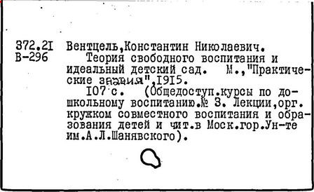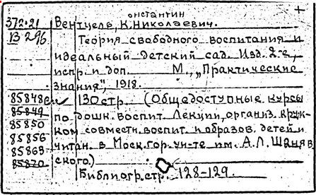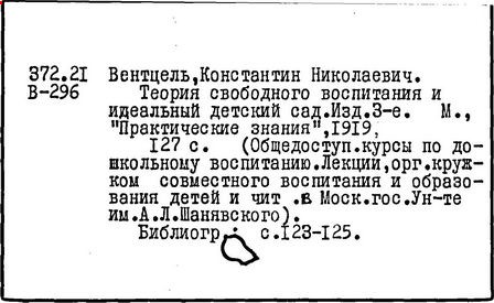 Литература: Чехов Н. В., К. Н. Вентцель (1857 - 1947). [Некролог], Начальная школа, 1947, № 5; Королев Ф. Ф., К. Н. Вентцель - виднейший представитель свободного воспитания (1857-1947), Советская педагогика, 1964, № 4; Винокуров С. В., Пчельников Т. С., К. Н. Вентцель, в кн.: Видные русские педагоги в Воронежском крае, Воронеж, 1972; Михайлова М. В., Дом свободного ребенка, Советская педагогика, 1983, № 4.