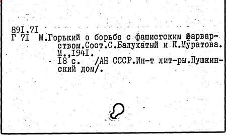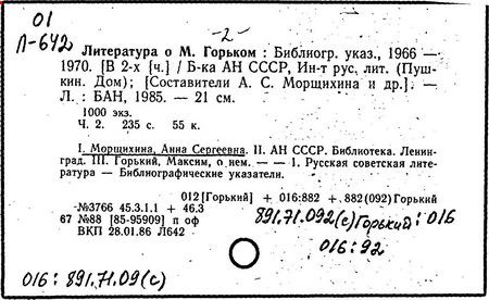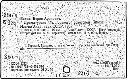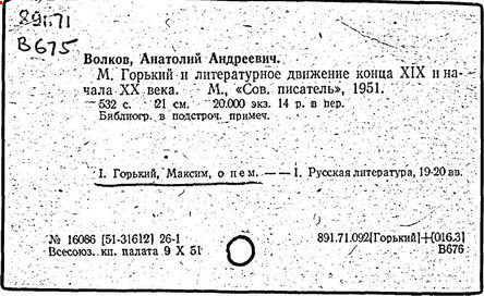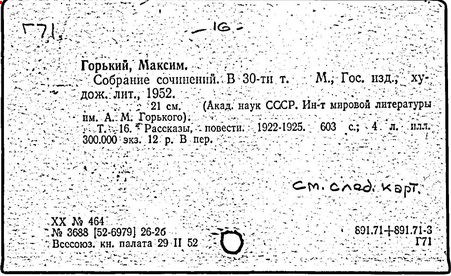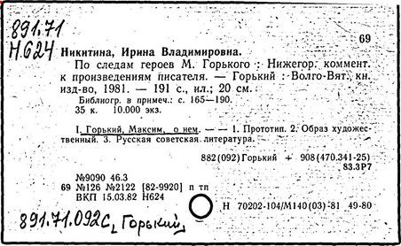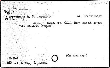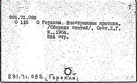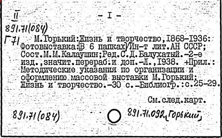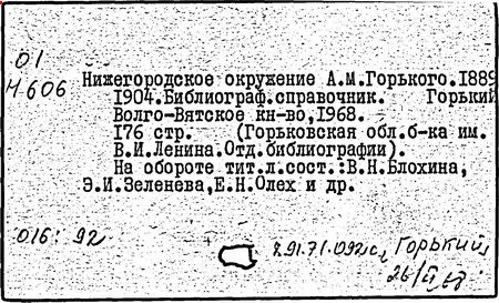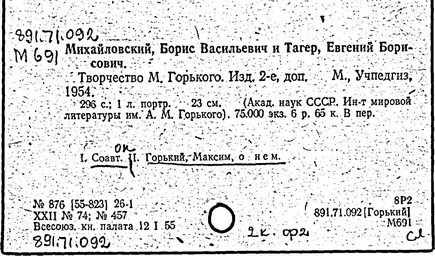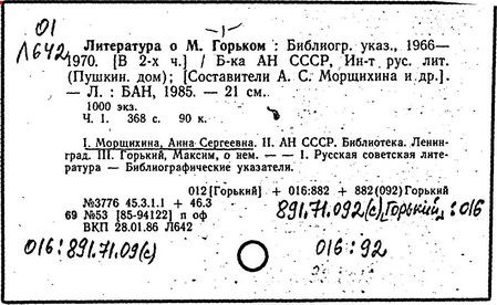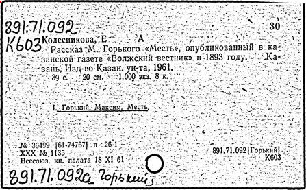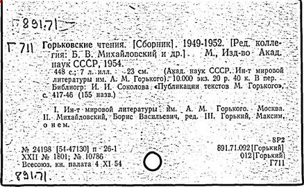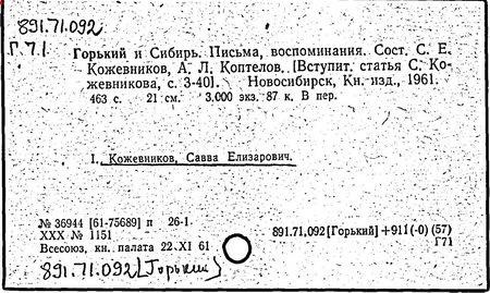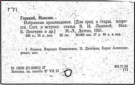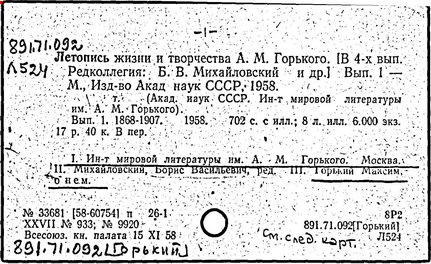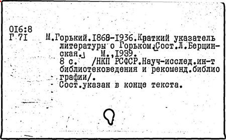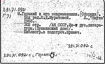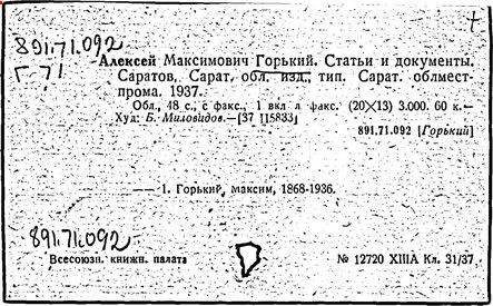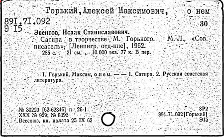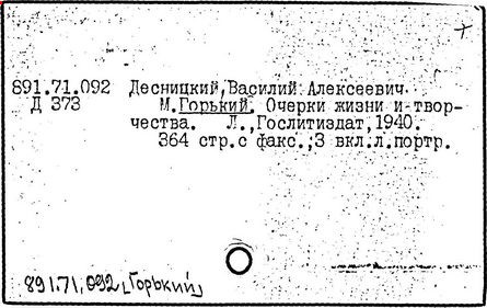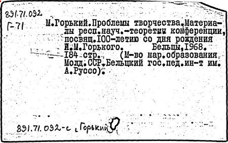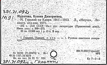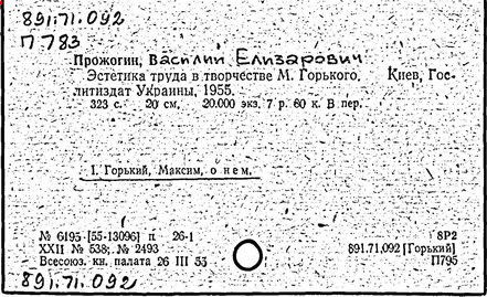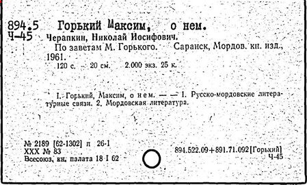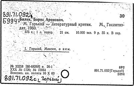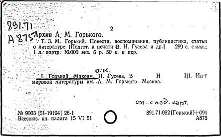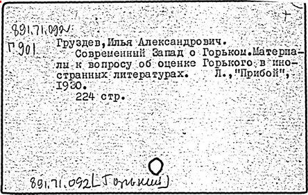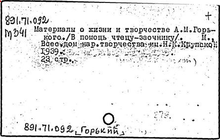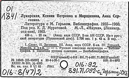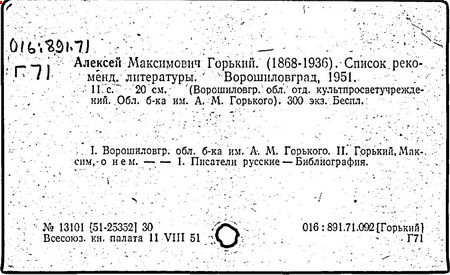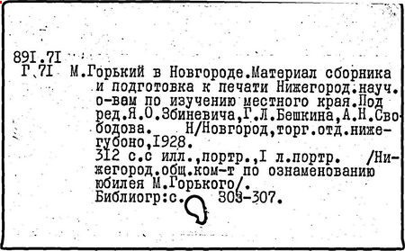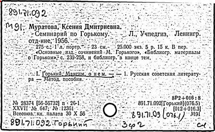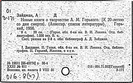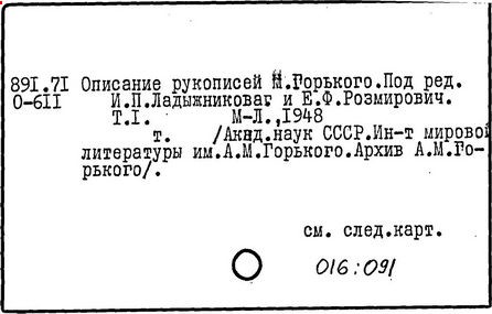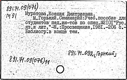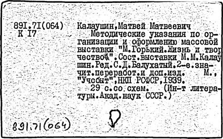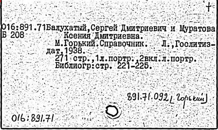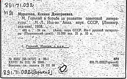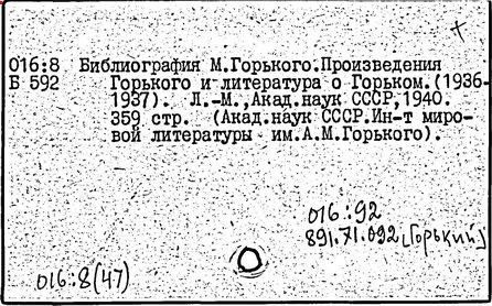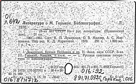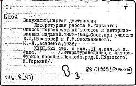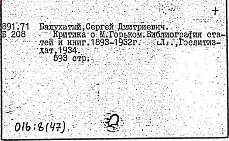 Библиография: Балухатый С. Д. Литературная работа М. Горького. М.; Л., 1936; Описание рукописей М. Горького / под ред. И. П. Ладыжникова и Е. Ф. Розмирович. Т. 1. М.; Л., 1948; Балухатый С. Д. Критика о М. Горьком. 1893-1932. Л., 1934; Балухатый С. Д., Муратова К. Д. Литературная работа М. Горького. Дополнительный список. 1889-1937. М.; Л., 1941; Произведения М. Горького в переводах на иностранные языки: библиогр. указ. М., 1958; Русская литература конца XIX - начала XX века: библиогр. указ. Т. 1. М.; Л., 1963.