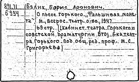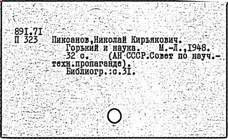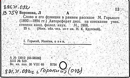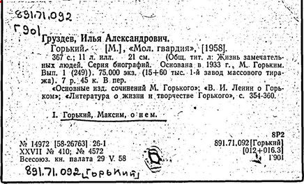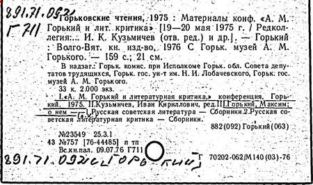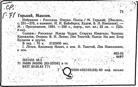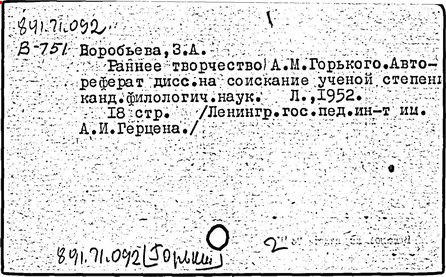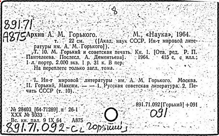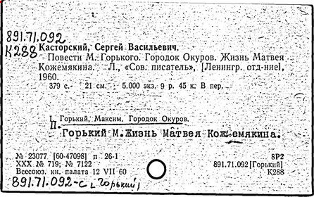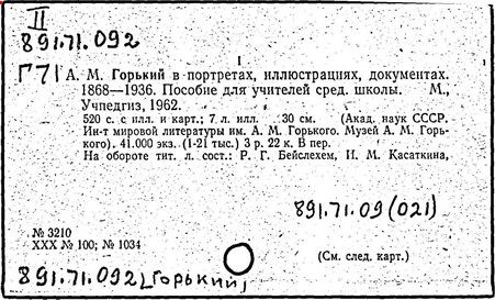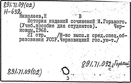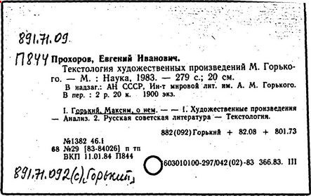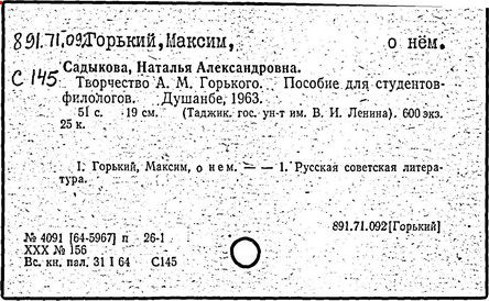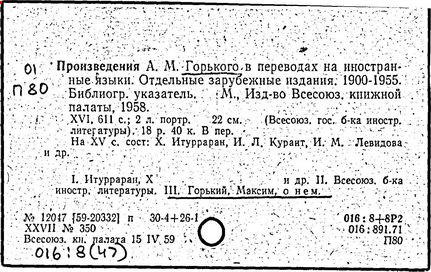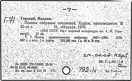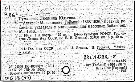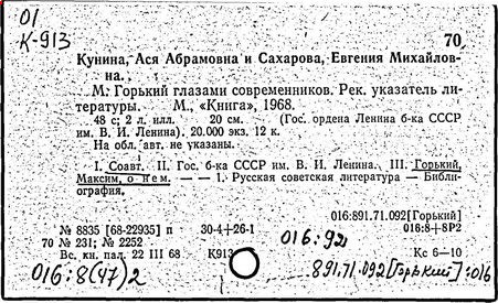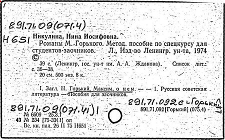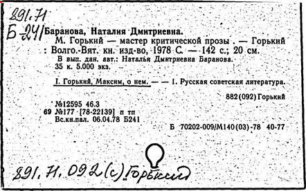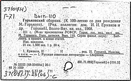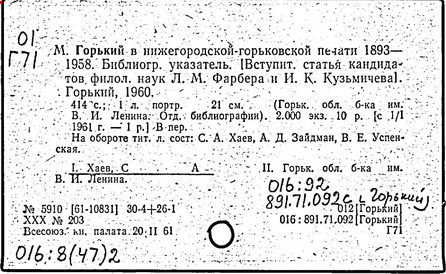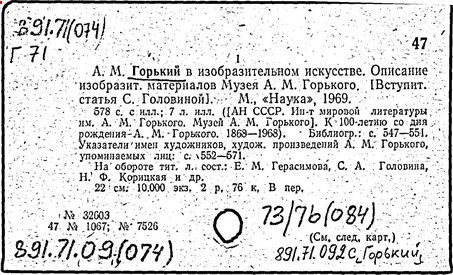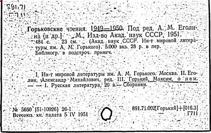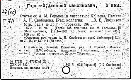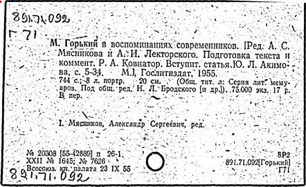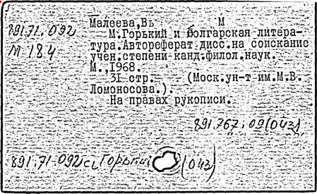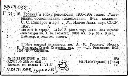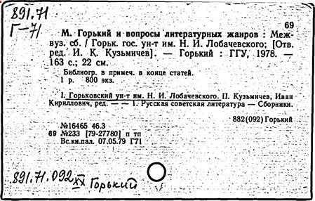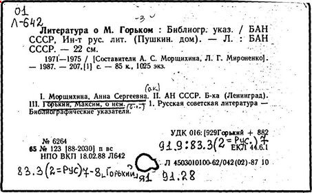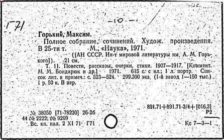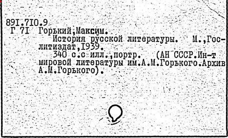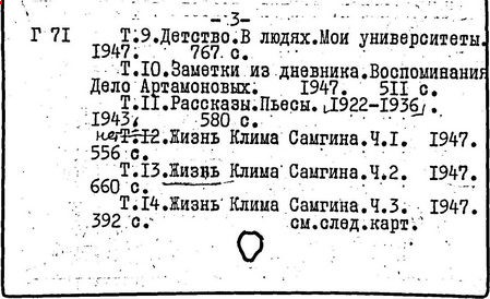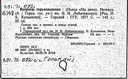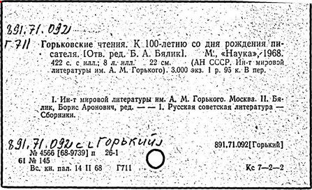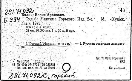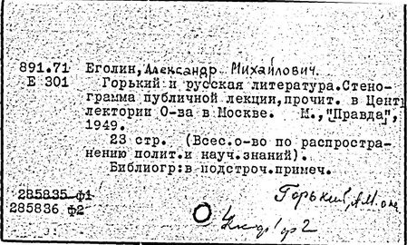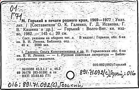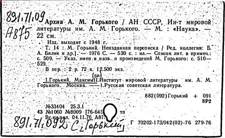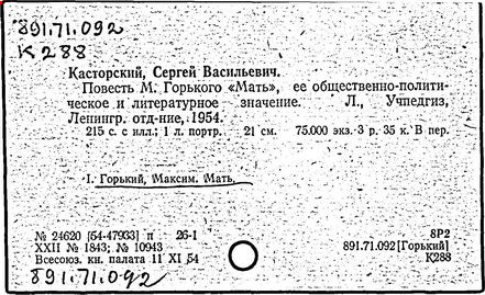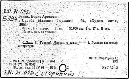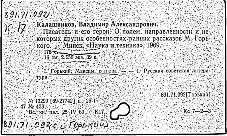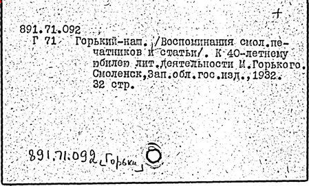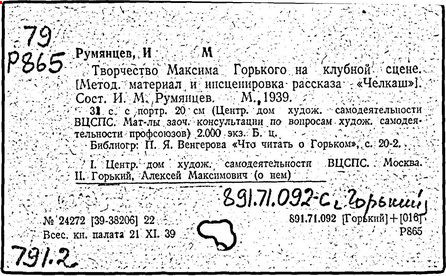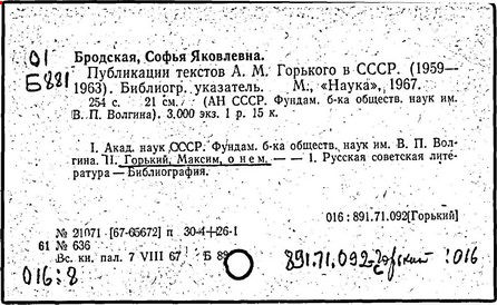 Библиография: Балухатый С. Д. Литературная работа М. Горького. М.; Л., 1936; Описание рукописей М. Горького / под ред. И. П. Ладыжникова и Е. Ф. Розмирович. Т. 1. М.; Л., 1948; Балухатый С. Д. Критика о М. Горьком. 1893-1932. Л., 1934; Балухатый С. Д., Муратова К. Д. Литературная работа М. Горького. Дополнительный список. 1889-1937. М.; Л., 1941; Произведения М. Горького в переводах на иностранные языки: библиогр. указ. М., 1958; Русская литература конца XIX - начала XX века: библиогр. указ. Т. 1. М.; Л., 1963.