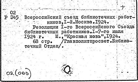 Литература: Библиотечная работа в Красной Армии: Переработанные материалы пленума и секций. М.; Л., 1926; Первый библиотечный съезд РСФСР (с 1-го по 7-е июля 1924 г.): материалы пленума и секций. М., 1925.