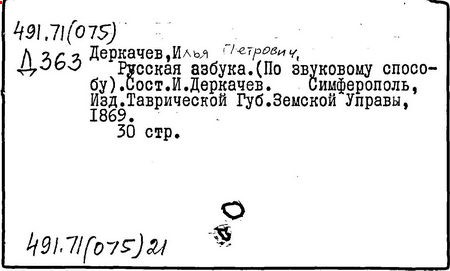 Деркачёв, И. П.Русская азбука. (По звуковому способу) / И. П. Деркачев. – Симферополь : Изд. Таврич. губ. зем. управы, 1869. – 30 с.
