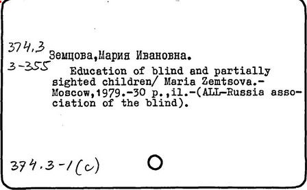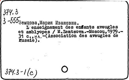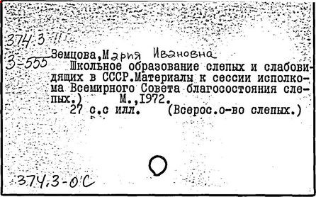Литература: Выдающийся тифлопедагог М. И. Земцова: биобиблиогр. указ. / сост. И. А. Юрьева. М., 1992.