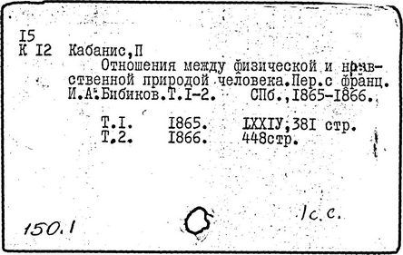 французский врач и философ материалистической ориентации. Место рождения - Конак, Коррез. Был непосредственным участником Великой французской революции. Конвент поручил ему выяснить, причиняет ли нож гильотины физические страдания. Сознательные ощущения после отсечения головы невозможны. Этот вывод базировался на выдвинутом Кабанисом представлении о трех уровнях поведения: рефлекторном, полусознательном и сознательном. Для каждого имеется своя система органов. Преемственность между ними выражена в том, что низшие центры при отпадении высших способны к самостоятельной активности. Кабанис опирался на методологические принципы, выработанные предшествующим поколением материалистов. Прежде всего, он был непоколебимо уверен в том, что сознание и тело нераздельны и, стало быть, влияние психического (морального) на организм не может означать ничего иного, кроме влияния мозговой системы как органа мысли и воли на другие органы. Соединение учения об ощущениях как первоэлементах ума с физиологическим представлением о чувственном раздражении как первоэлементе рефлекторной мышечной реакции было вторым важным принципом. Чувствительность, из которой, согласно ставшему к тому времени общепринятым убеждению, синтезируются все человеческие идеи, соединялась не только с мозгом, но и с ответной двигательной активностью тела. В соответствии же с теорией уровней возникал вопрос о применимости способа объяснения, принятого для элементарных уровней к высшему. Обсуждая вопрос о природе мышления, Кабанис предложил следующую формулировку: чтобы получить правильную идею о действиях, результатом которых является мысль, мы должны рассматривать мозг как особый орган, специально предназначенный для ее производства, так как желудок и кишки предназначены для пищеварения, печень — для очищения желчи, слюнные железы — для изготовления слюны. Впечатления, достигающие мозга, приводят его в деятельное состояние, подобно тому как пищевые продукты, попадая в желудок, вызывают выделение в достаточном количестве желудочного сока и движения, благоприятствующие их растворению. Эта формула ознаменовала новый шаг в естественнонаучном объяснении сознания. Впервые однозначно утверждалось, что сознание не есть локализованное в мозгу духовное начало субстанционального или феноменального характера, а функция этого телесного органа, не уступающая по степени реальности и телесности другим функциям организма. Общей у этой функции с другими стала, по Кабанису, принципиальная схема переработки поступающего извне материала в новые продукты. Процесс мышления осуществляется следующим образом. Впечатления достигают мозга посредством нервов; в то время они еще изолированы и бессвязны. Мозг приходит в активное состояние; он начинает действовать... и вскоре обращает их в идеи, которые получают внешнее выражение в языке мимики и жестов или в знаках слов и письма. Вход и выход этой системы доступны объективному наблюдению. Но что представляет собой внутренний процесс? Могут сказать: разве нам известны органические движения, посредством которых осуществляются функции мозга? Но и действия, посредством которых нервы желудка определяют различные операции, из которых состоит пищеварение... не менее скрыты от нашего исследования. Следовательно, речь идет о т