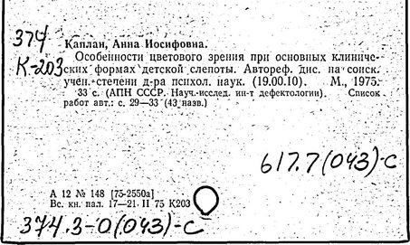 российский психолог, дефектолог, доктор психологических наук (1976 г.). Училась на историческом факультете МГУ (1939-1941 гг.), закончила лечебный факультет Московского медицинского института Министерства здравоохранения РСФСР по специальности врач-офтальмолог (1945 г.) и ординатуру института (1945-1948 гг.). Работала ассистентом кафедры в Московском медицинском институте Министерства здравоохранения РСФСР (1949-1952 гг.), врачом-офтальмологом в Московском городском врачебно-физкультурном диспансере (1952-1961 гг.), с 1961 г. - в Институте дефектологии Академии педагогических наук СССР. Каплан проводила работу по изучению и использованию остаточных зрительных функций у слепых учащихся специальных школ. Разрабатывала общие проблемы детской слепоты, исследовала основные ее клинические формы («Охрана остаточного зрения в школе для слепых детей», 1965 г.). Данные, полученные при изучении свойств остаточного зрения, использовались при организации обучения детей. Особое внимание в работах Каплан уделялось исследованию цветового компонента остаточного зрения. В этих целях для оценки остаточного зрения ею был введен коэффициент устойчивости цветоразличения, величина которого связана с состоянием нейропсихической сферы. Значительная часть исследований Каплан была направлена на изыскание возможностей целенаправленного развития зрительного восприятия детей с остаточным зрением («Детская слепота. Цветовое остаточное зрение», 1979 г.).