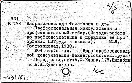 российский ученый, специалист в области профконсультации, организатор профконсультационной службы в СССР. Закончил естественное отделение физико-математического факультета Петроградского университета (1915-1916 гг.). Ученик В. М. Бехтерева. Трагически погиб в Ленинграде во время военной блокады зимой 1941 - 1942 гг. Работая ученым секретарем Института мозга, Кларк исследовал вопросы диагностики сценического дарования, особенности творческого труда. Создал отдел психотехники и профориентации в Ленинградском Детском обследовательском институте Психоневрологической академии (1924 г.), в котором проводились массовые психотехнические обследования учащихся старших классов средних школ для выявления их общей и специальной одаренности. В 1927 г. организует по инициативе В.М. Бехтерева первое в СССР Бюро профконсультации Наркомтруда СССР при Ленинградском Институте мозга и Ленинградской бирже труда. Под руководством Кларка разрабатывались организационные формы, методы и принципы работы в области профессиональной консультации, обеспечивающие тесную взаимосвязь психологических, медицинских, педагогических и производственных данных о человеке. В 1930-е гг. Кларк - организатор и Руководитель Центральной профконсультационной лаборатории РСФСР при Ленинградском институте организации, экономики и охраны труда, в рамках которой проводились исследования в области профессиографии, психодиагностики, профподбора и дифференциального распределения подростков для производственного обучения в фабрично-заводских училищах. Изучались проблемы устойчивости профустремленности подростков и ее связи с уровнем их развития; разрабатывались методы выявления их знаний,проводился анализ влияния социальных и биологических факторов на результаты психотехнического обследования и т.д. По инициативе Кларка была организована сеть бюро профконсультации при биржах труда во многих важных промышленных центрах СССР; лаборатория принимала участие в подготовке кадров профконсультантов - психотехников («Вопросы профконсультации и профотбора» / под ред. К., 1928; «Профотбор и профессиональная консультация», в соавт., 1930; «Материалы профконсультации», под ред. Кларка (1933, вып. 1; 1935, вып. 2).