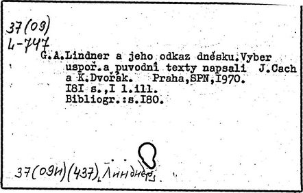 Литература: Kral J., G. A. Lindner. Zivot a filosofie, в кн.: Lindner G. A., Myslenky k psychologii spolecnosti jako zaklad spolecenske vedy, Praha, 1929; его же, Studie o G. A. Lindnerovi, Brat., 1930.