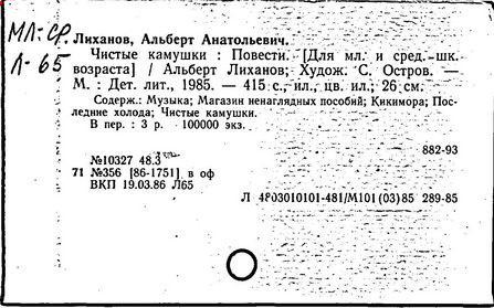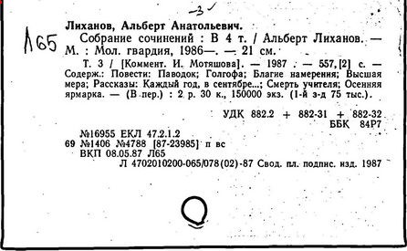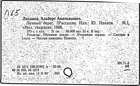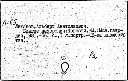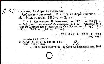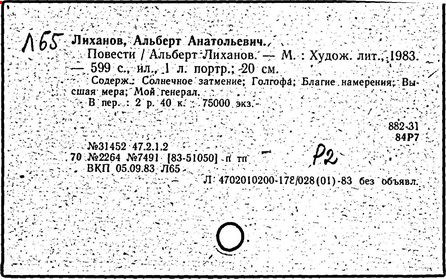 Трилогия Лиханова "Семейные обстоятельства" ("Чистые камушки", "Лабиринт", "Обман"; все - 1974), романы и повести "Мой генерал" (1975), "Солнечное затмение" (1977), "Кикимора" и "Магазин ненаглядных пособий" (1983), "Последние холода" (1984), "Детская библиотека" (1985) и книги для взрослых "Голгофа" (1979), "Благие намерения" (1980), "Высшая мера" (1982), "Драматическая педагогика" (1983, 19903) посвящены проблемам нравственного воспитания подростка, вступающего в сложные взаимоотношения с окружающим миром, ответственности взрослых за детей. Некоторые произведения Лиханова экранизированы (художественный фильм "Благие намерения" получил премию Международной католической организации кино- и аудиовизуальных средств, 1986). Государственная премия РСФСР (1980), Международная премия им. Я. Корчака (1987).