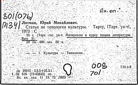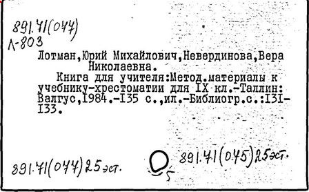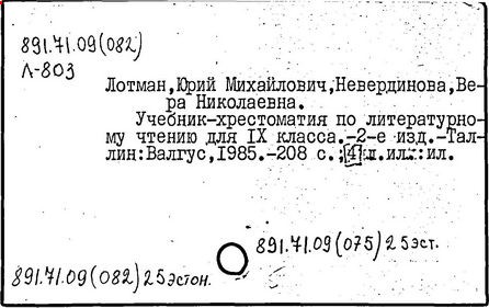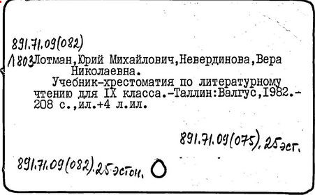 филолог и культуролог, доктор филологических наук (1962 г.), действительный член Академии наук Эстонии (1990 г.), член многих зарубежных академий. Родился в Петрограде. Окончил Ленинградский государственный университет (1950 г.). С 1963 г. профессор Тартуского университета. Автор трудов в области структурной поэтики, семиотики и истории русской литературы, связанных между собой единым подходом к культуре как динамичной знаковой системе, открывающей в процессе взаимодействия её различных сфер (науки, искусства и др.), историко-культурных моделей, художественных языков новые содержательные стороны. Культура, по Лотману, в своём развитии отражает сложность бытия, непредсказуемость и многовариантность исторического процесса. Опираясь на идеи полифонии художественного мышления и диалога культур (М. М. Бахтин), Лотман показывает многомерность культурного пространства и утверждает право искусства "вырваться из сферы однозначных смыслов" для свободного творчества, требующего этической ответственности человека. Представление о единстве научных и этических подходов в сфере культурной деятельности, стремящейся к открытому поиску истины - существенная часть культурологической концепции Лотмана, придающая ей особое просветительское значение ("Лекции по структуральной поэтике", 1964; "Статьи по типологии культуры", в. 1-2, 1970-73; "Анализ поэтического текста", 1972; "Роман в стихах Пушкина "Евгений Онегин". Спецкурс. Вводные лекции в изучение текста", 1975). Создал ряд пособий для средней школы, ориентированных на формирование у учащихся культуры мысли и эмоций, эстетической интуиции, способности к восприятию искусства в его идейно-художественной целостности. Написанные Лотманом в соавторстве с В. Невердиновой "Учебник-хрестоматия по литературному чтению для 9 класса" (1982 г.) и "Книга для учителя. Методические материалы к учебнику-хрестоматии для 9 класса" (1984 г.) обобщают опыт построения курса рус. языка и литературы в эстонской средней школе. В структуре учебника заложена определённая композиционная идея, позволяющая ученику по мере постижения художественных произведений осмыслить нравственное единство русской литературы. Разбор тематики и проблематики произведений направлен на раскрытие внутренних закономерностей и связей литературного процесса. Одновременно от автора к автору усложняется и углубляется изучение явлений стилистики и поэтики. Смена лирических, героических, сатирических мотивов создаёт определённый эмоциональный ритм восприятия художественной словесности. В учебнике разработана система анализа произведений (различная для прозаических и поэтических жанров), включающая использование дополнит, текстов: очерков "быта и нравов" эпохи, обзора общей проблематики творчества писателя, истории прочтения книги, отрывков из воспоминаний современников, подробных стилистических комментариев; комплекса упражнений: дотекстовых (обработка новой лексики, фразеологизмов и т. д.) и послетекстовых, направленных на выработку навыков выразит, чтения, активной речи, искусства интерпретации произведения, формирования собственного мнения. Учащимся средней школы адресованы также учебники по русской литературе на эстонском языке для 9 и 11 классов (последний составлен совместно с 3. Г. Минц и С. Г. Исаковым).