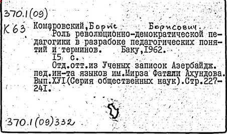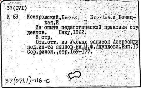 Составил "Большой педагогический словарь" (1946 – 1950 гг.), частично опубликованный в журнале "Азербайджан Мектеби" ("Азербайджанская школа", 1946, № 5; 1947, № 1-3, 5-6; 1948, № 1). На основе работ Комаровского по педагогической терминологии разработаны пособия для студентов – краткие словари педагогических терминов в Пятигорском педагогическом институте иностранных языков, Узбекском республиканском педагогическом институте русского языка и литературы и др.