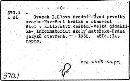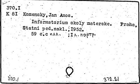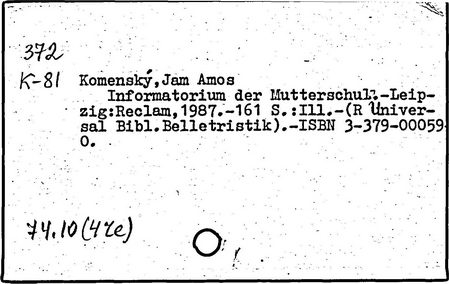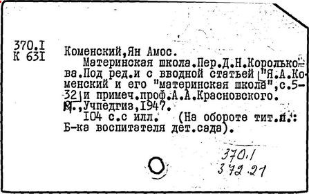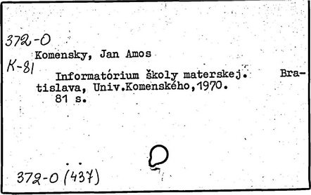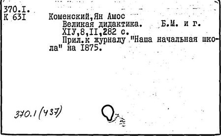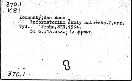В 1631-1632 гг. Коменский переработал "Дидактику", назвав её "Рай церкви или рай чешский", и сделал составной частью первого проекта реформы образования и воспитания в Чехии. Он предполагал также в дополнение к "Дидактике" создать учебники и методическую литературу. Закончил Коменский лишь "Информаторий материнской школы", ставший первой теорией дошкольного воспитания детей до 6 лет. В сочинении раскрывались специфика воспитания на каждом этапе жизни ребёнка, соотношение физического и нравственного воспитания, взаимосвязь активной деятельности детей с нравственным и религиозным воспитанием, умственного развития и формирования речи ребёнка. Отмечая многообразное значение детских игр, Коменский подчёркивал и необходимость систематического, соразмерного с возрастом ребёнка, ненасильственного ознакомления детей с самыми простыми знаниями о мире.