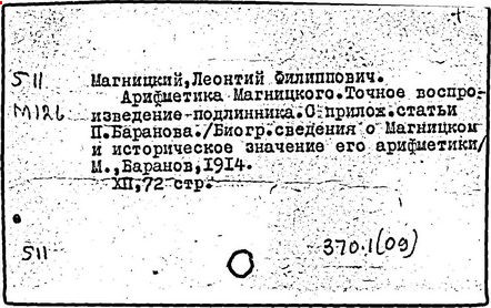 1. Баранов П. «Арифметика Магницкого. Точное воспроизведение подлинника. С приложением статьи П. Баранова «Биографические сведения о Магницком и историческое значение его Арифметики». М.: Изд. П. Баранова.1914, с. 86.