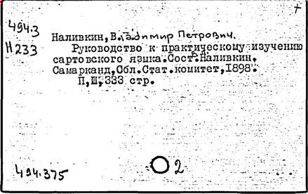 востоковед, педагог, общественный деятель. Родился в Калуге. Окончил Павловское военное училище в Петербурге (1873 г.). Офицером участвовал в походах в Коканд и Хиву (1873-1875 гг.). Закончив военную службу (1878 г.), поселился близ Намангана; изучал арабский и персидский языки, быт и язык сартов (городское население Ферганской, Сырдарьинской и Самаркандской областей - этническая группа в формировавшейся узбекской нации). С декабря 1884 г. учитель в первой русско- туземной школе в Ташкенте. Составил первый русско-сартовский и сартовско-русский словарь с кратким очерком грамматики сартовского языка (совместно с женой - М. В. Наливкиной; изданную в Казани в 1884 г.), "Азбуку для русско-мусульманских школ..." (1886 г.), "Сартовско-персидскую хрестоматию..." (1887 г.). Эти книги Наливкина были тесно связаны с бытовыми реалиями и местным фольклором. Они положили начало школьной литературе для изучения русскими узбекского языка и узбеками русского. Преподавал (до 1890 г.) в Туркестанской учительской семинарии; для неё написал "Руководство к практическому изучению сартовского языка" (изд. в 1898, 1911 гг.), сартовскую хрестоматию (1896 г.). Автор "Краткой истории Кокандского ханства" (Казань, 1886 г.). В 1890-1895 гг. инспектор мусульманских школ Ферганской, Сырдарьинской и Самаркандской областей. Был помощником губернатора Ферганской области. Педагогическая деятельность и публикации по вопросам народного образования в местных газетах принесли Наливкину известность в Туркестане. В 1907 г. избран депутатом 2-й Государственной думы. В марте 1917 г. выступил от её социал-демократической фракции с требованием отмены полевых судов. В июле 1917 г. стал председателем Туркестанского комитета Временного правительства. Добивался признания власти Временного правительства всеми политическими силами Туркестана, представленными в административном центре - Ташкенте. После перехода власти в Ташкенте к Советам (ноябрь 1917 г.) находился на нелегальном положении. Покончил жизнь самоубийством в Ташкенте.