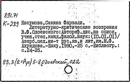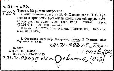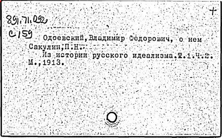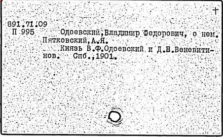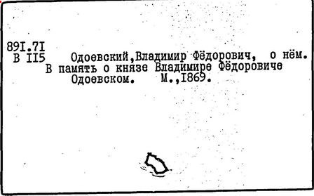 Литература: Сакулин П. Н. Из истории русского идеализма. Кн. В. Ф. Одоевский. Мыслитель. Писатель, т. 1, ч. 1-2. М., 1913; Большакова В. В. Психологические взгляды В. Ф. Одоевского // Вопросы психологии. – 1989. – № 5. – С. 122-129; Турьян М. А. Странная моя судьба. О жизни В. Ф. Одоевского. М., 1991.