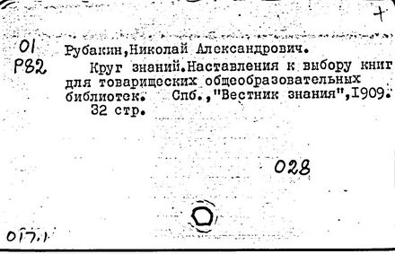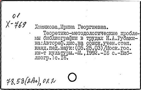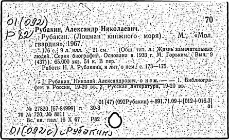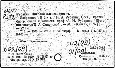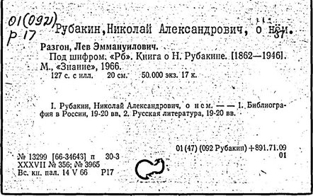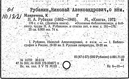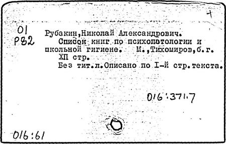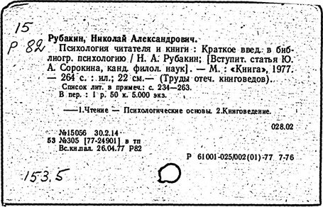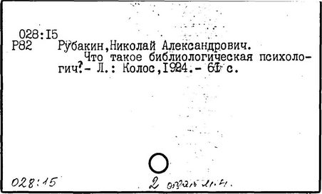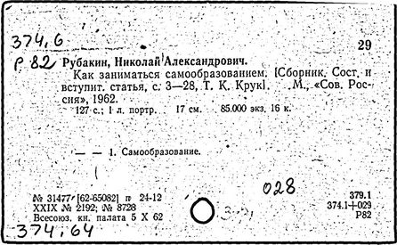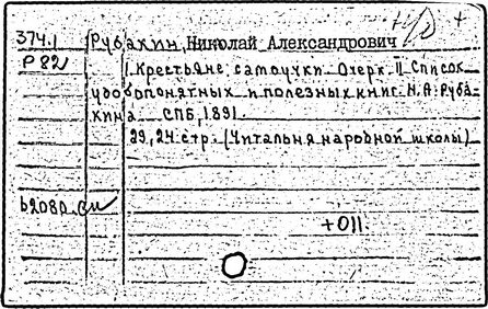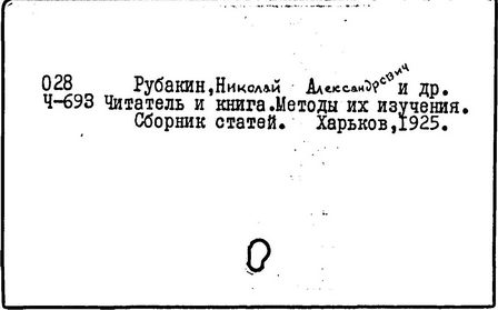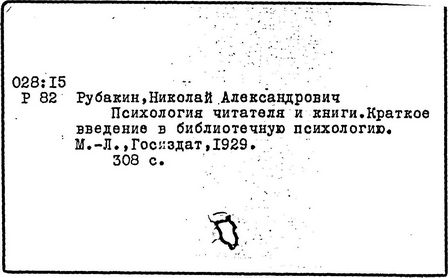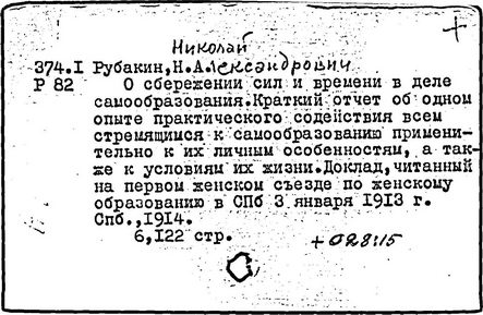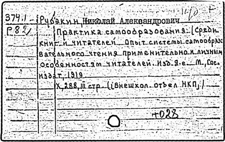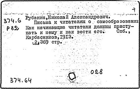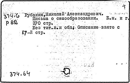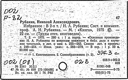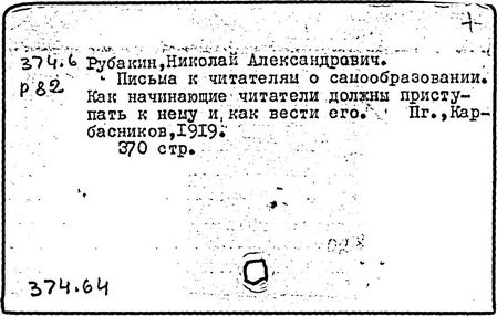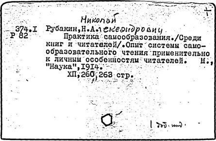 Литература: Сорокин Ю. А., Библиопсихологическая теория Н. А. Рубакина и смежные науки, в сб.: Книга. Исследования и материалы, в. 17, М., 1968; Разгон Л., Под шифром "Рб". Книга о Н. Рубакине, М., 1966; Мавричева К. Г., Н. А. Рубакин, М., 1972; Рубакин А. Н., Рубакин. Лоцман книжного моря, М., 1979; Айзенберг А. Я., Самообразование: история, теория и современные проблемы, М., 1986.