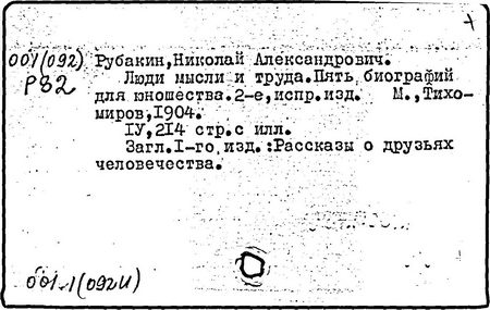 книговед, теоретик самообразования, писатель. Родился в Ораниенбауме (ныне Ломоносов Ленинградской области). Окончил физико-математический и юридический факультеты Петербургского университета (1887 г.). Один из основателей Отдела помощи самообразованию при Педагогическом музее военно-учебных заведений в Петербурге. В 1892 г. Рубакин возглавил частную общедоступную библиотеку, которой широко пользовались учителя воскресных школ. Сотрудничал с издателями в выпуске массовой научно-популярной литературы. В 1901 г. и 1904 г. за антиправительственные выступления подвергся аресту и высылке из столицы. В 1908 г. выехал в Швейцарию. Покидая родину, передал личную библиотеку (свыше 100 тысяч томов) петербургскому отделу Лиги образования. В Швейцарии создал новую публичную библиотеку, которой пользовались деятели русской эмиграции.