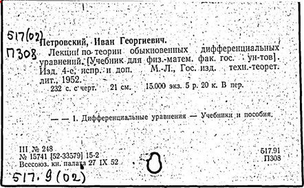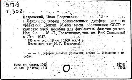 советский математик, академик (1946; член-корреспондент 1943) и член Президиума (с 1953) АН СССР, Герой Социалистического Труда (1969). Родился в г.Севск, ныне Брянской области. По окончании в 1927 Московского университета работал там же (с 1933 профессор, с 1951 ректор). Основные труды относятся к теории дифференциальных уравнений с частными производными, алгебраической геометрии, теории вероятностей, качественной теории обыкновенных дифференциальных уравнений, математической физике и другим областям математики. Петровский заложил основы общей теории систем дифференциальных уравнений с частными производными; выделил и изучил классы эллиптических, гиперболических и параболических систем; установил аналитичность решений эллиптических систем (1937), изучил задачу Коши для гиперболических и параболических систем (1936), исследовал зависимость решений задачи Коши отначальных данных, установив условия существования лакун и диффузии волн (1944). Работы по теории вероятностей (1934) оказали большое влияние на развитие теории случайных процессов. Петровский изучал вопрос (1933) о расположении овалов алгебраической кривой на проективной плоскости. Созданный им метод позволил получить глубокие результаты по топологии алгебраических многообразий любой размерности (1949).