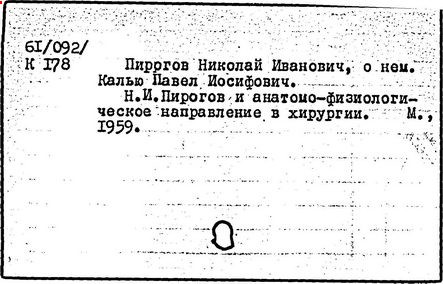 анатом, хирург, педагог, обществ, деятель, член-корреспондент Петербургской АН (1846). Родился в Москве. В 1828 окончил медицинский факультет Московского университета, готовился к профессуре (1828-1832) при Дерптском университете, затем на 2 года был направлен в Германию (Берлин, Гёттинген) для научного и профессионального совершенствования. С 1836 профессор Дерптского университета, с 1841 - Медико-хирургической академии в Петербурге. Был организатором помощи раненым в военных действиях на Кавказе (в 1847) и в период Крымской войны (1854-1855). С 1856 занимал должность попечителя Одесского учебного округа, с 1858 - Киевского. С последнего поста уволен в марте 1861. В 1862-1866 руководил занятиями молодых учёных, направленных для подготовки к профессорской деятельности за границу (Гейдельберг). С 1866 в отставке, жил в своём имении в с. Вишня. В 1870 и 1877 по просьбе Общества Красного Креста во время франко-прусской и русско-турецкой войн выезжал в действующую армию для оказания помощи раненым и больным. В мае 1881 в Москве торжественно отмечено 50-летие научной и практической деятельности Пирогова, он был избран почётным гражданином Москвы.